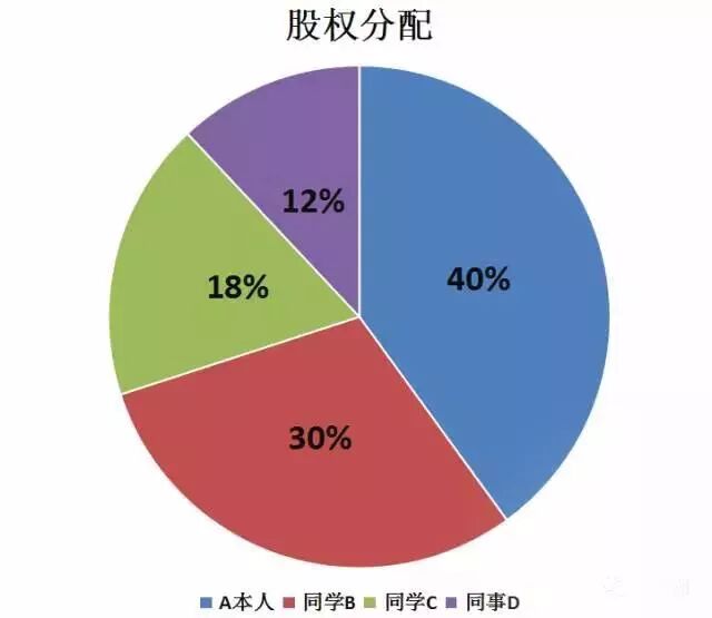 同学B占股权30%;同学C占股权18%;同事D占股权12%;A本人占股权40%。